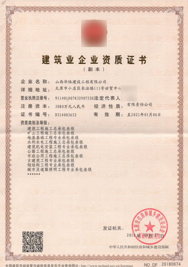 山西某建筑工程公司多項(xiàng)建筑資質(zhì)