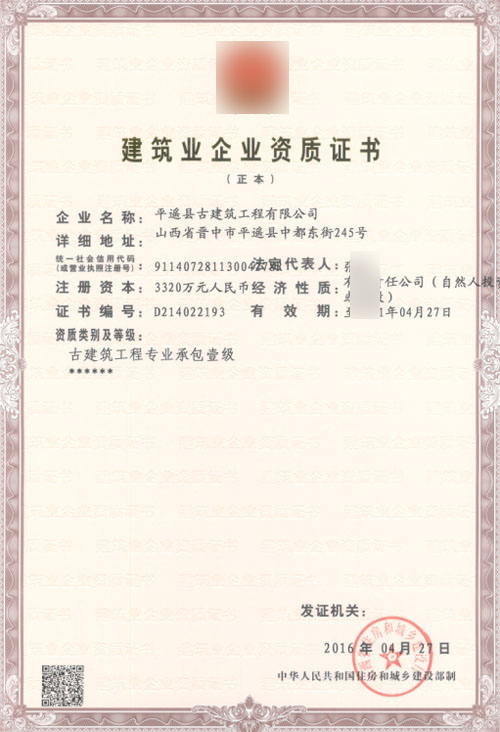平遙某古建筑公司古建筑工程專業(yè)承包一級(jí)資質(zhì)