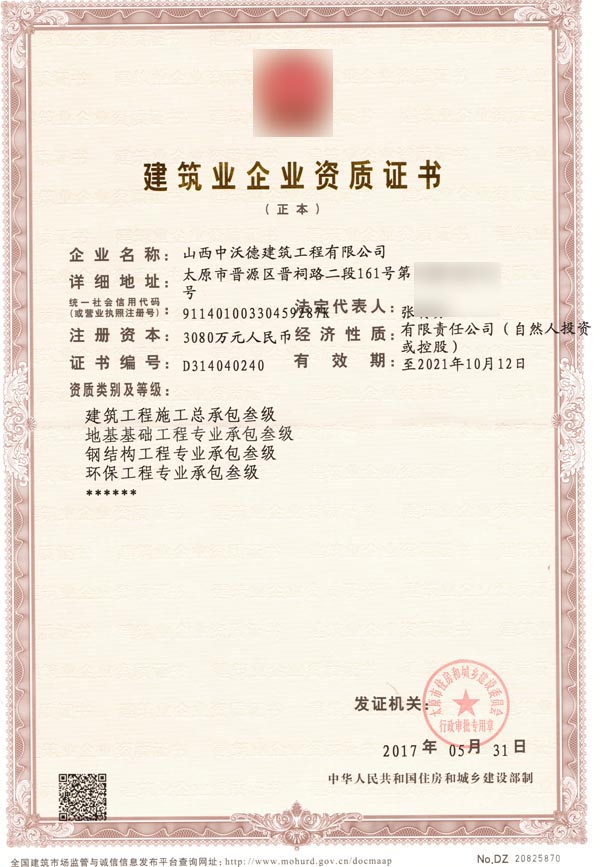 山西某建筑公司建筑業(yè)企業(yè)資質(zhì)證書